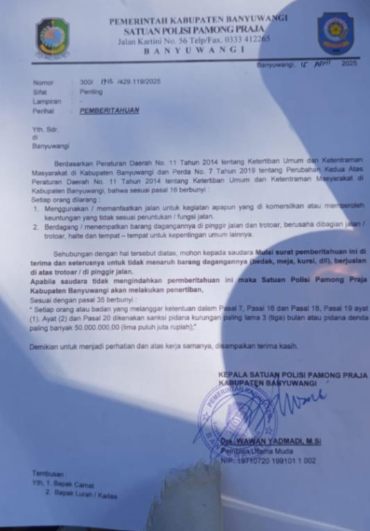 Banyuwangi – Liputan Warta Jatim, Koordinator Pusat Kajian Kebijakan dan Pembangunan Strategis (PUSKAPTIS), MOHAMAD AMRULLAH, S.H., M.Hum, melontarkan kritik keras terhadap langkah Bupati Banyuwangi yang dianggap tidak berpihak kepada pelaku UMKM, khususnya pedagang kaki lima (PKL). Kritik ini merespons surat pemberitahuan dari Satpol PP tertanggal 16 April 2025, yang memperingatkan para PKL agar menghentikan aktivitas berdagang di trotoar dan pinggir jalan dengan ancaman penertiban dan sanksi hukum.