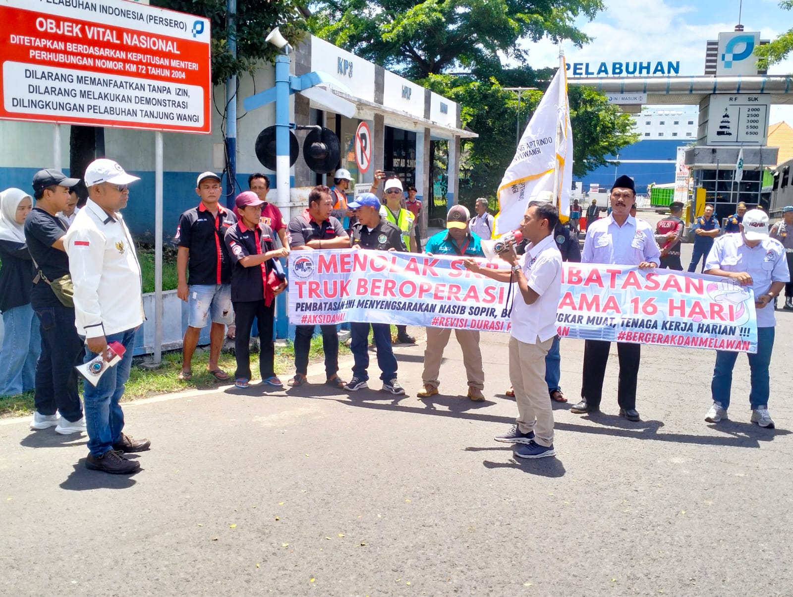 Banyuwangi – Liputan Warta Jatim, Asosiasi Sopir Logistik Indonesia (ASLI) dan Asosiasi Pengusaha Truk Indonesia (Aptrindo) lakukan demo di depan pintu masuk Pelabuhan Tanjungwangi Banyuwangi menolak durasi pembatasan angkutan barang selama arus mudik dan balik Lebaran 2025 yang terlalu lama. Dengan adanya kebijakan terbaru pemerintah, angkutan barang dilarang beroperasi selama 16 hari.