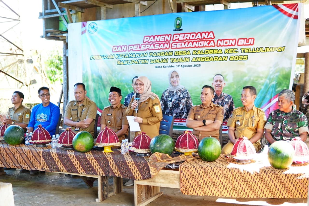 Sinjai — Liputan Warta Jatim, Bupati Sinjai Hj. Ratnawati Arif, didampingi Wakil Bupati Andi Mahyanto Mazda, melakukan panen perdana semangka non biji Program Ketahanan Pangan Desa Kalobba, Kecamatan Tellulimpoe, Selasa (12/8/2025).