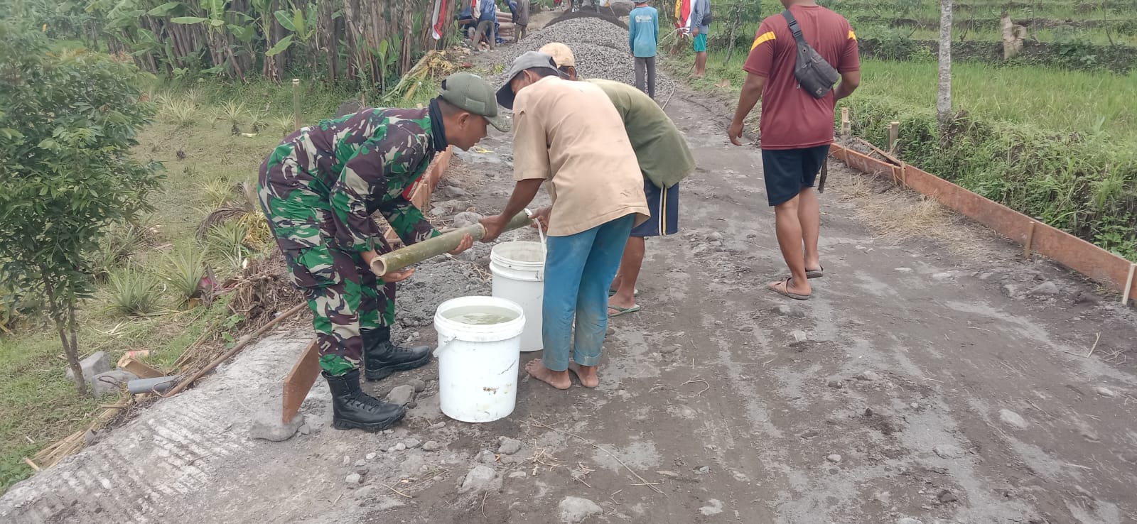 Boyolali – Liputan Warta Jatim, Personil Satgas TMMD Reg ke 123 Kodim 0724/Boyolali bersama masyarakat sedang mengisi air dengan cara manual/dipikul untuk pengecoran jalan rabat beton yang berada di Desa Kalinanas Kecamatan Wonosamudro Kabupaten Boyolali.Jumat (21/02/2025).