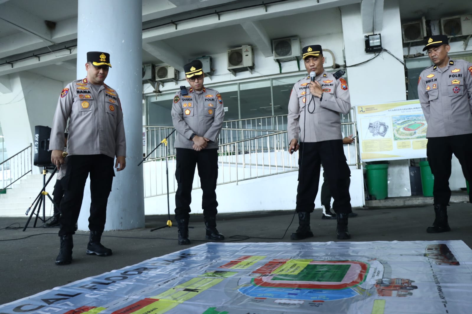 Usai apel, kegiatan dilanjutkan dengan Tactical Floor Game (TFG) untuk mematangkan strategi pengamanan di lapangan. Pada hari pertama, dua laga Grup B berhasil digelar dengan pengawalan ketat.