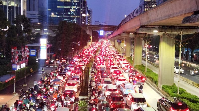 Pantauan liputanwartajatim.com sekitar Jam 19.15 WIB sedang GO-JEK, Rabu (7/8/2024), dengan tampak antrean kendaraan mengular di Jalan Gatot Subroto dari arah Pancoran. Dengan Sejumlah pemotor pun menerobos trotoar untuk menghindari kemacetan ini.