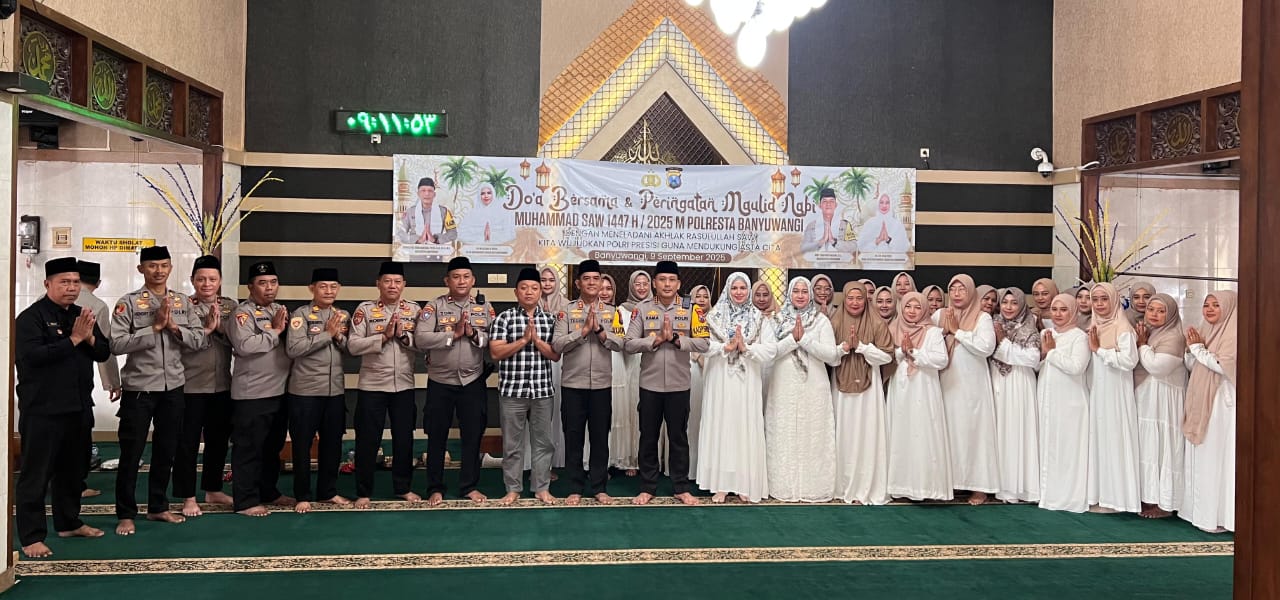 Banyuwangi – Liputan Warta Jatim, Suasana khidmat mewarnai peringatan Maulid Nabi Muhammad SAW 1447 H/2025 M yang digelar di Masjid Roudhotul Jannah Polresta Banyuwangi, Senin (8/9/2025).