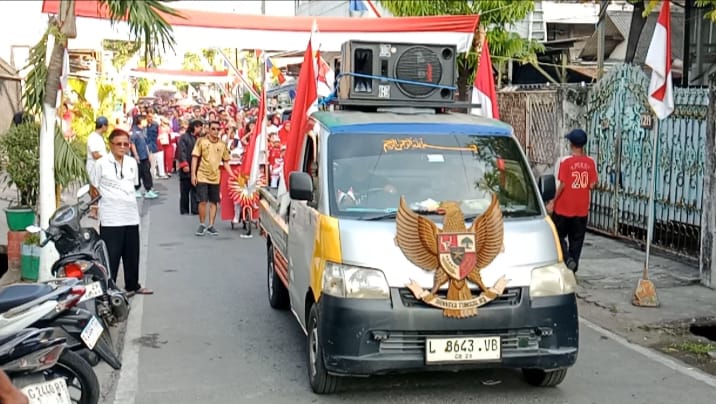 Surabaya – Liputan Warta Jatim, Semarak HUT RI yang ke 80 warga RT. 002 RW. 013, Kelurahan Petemon, Kecamatan Sawahan Surabaya, mengadakan bazar dan jalan sehat Karnival mengelilingi kampung Minggu 31/08/2025, (06.00) WIB