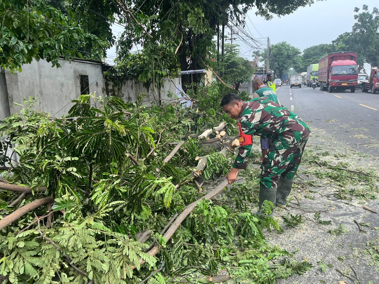 Serda Zaenal Arifin Babinsa 0819/11 Beji bersama Petugas gabungan dari BPBD Kabupaten Pasuruan, Bhabinkamtibmas serta warga setempat segera turun ke lokasi untuk membersihkan material pohon yang menghalangi jalan. Dengan menggunakan alat pemotong, mereka bergotong royong memotong batang dan cabang pohon agar arus lalu lintas dapat segera kembali normal. “Kami bersama petugas terkait dan masyarakat bergerak cepat untuk mengevakuasi pohon tumbang ini agar tidak semakin menghambat arus lalu lintas,” ujar Babinsa.