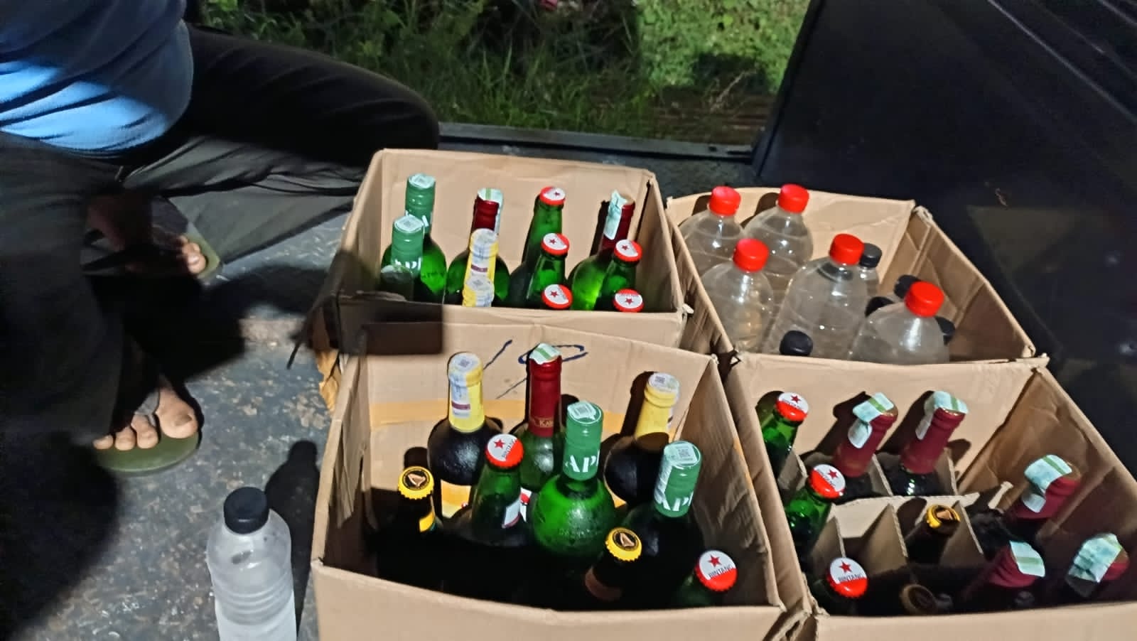 Barang bukti yang diamankan meliputi Arak kecil 8 botol, Arak besar 5 botol, Guinness 6 botol, Anggur Hijau Kawa-Kawa 6 botol, Bir Bintang 10 botol, Api 5 botol, Anggur Merah 4 botol