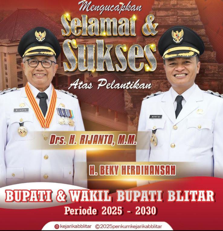 Selamat dan Sukses atas Pelantikan Drs. H. Riyanto, M.M., sebagai Bupati Blitar dan H. Beky Herdihansah sebagai wakil Bupati Blitar Jawa Timur Semoga senantiasa mendapatkan Rahmat dan Petunjuk Allah SWT dalam menjalankan tugas dan mengemban amanah.