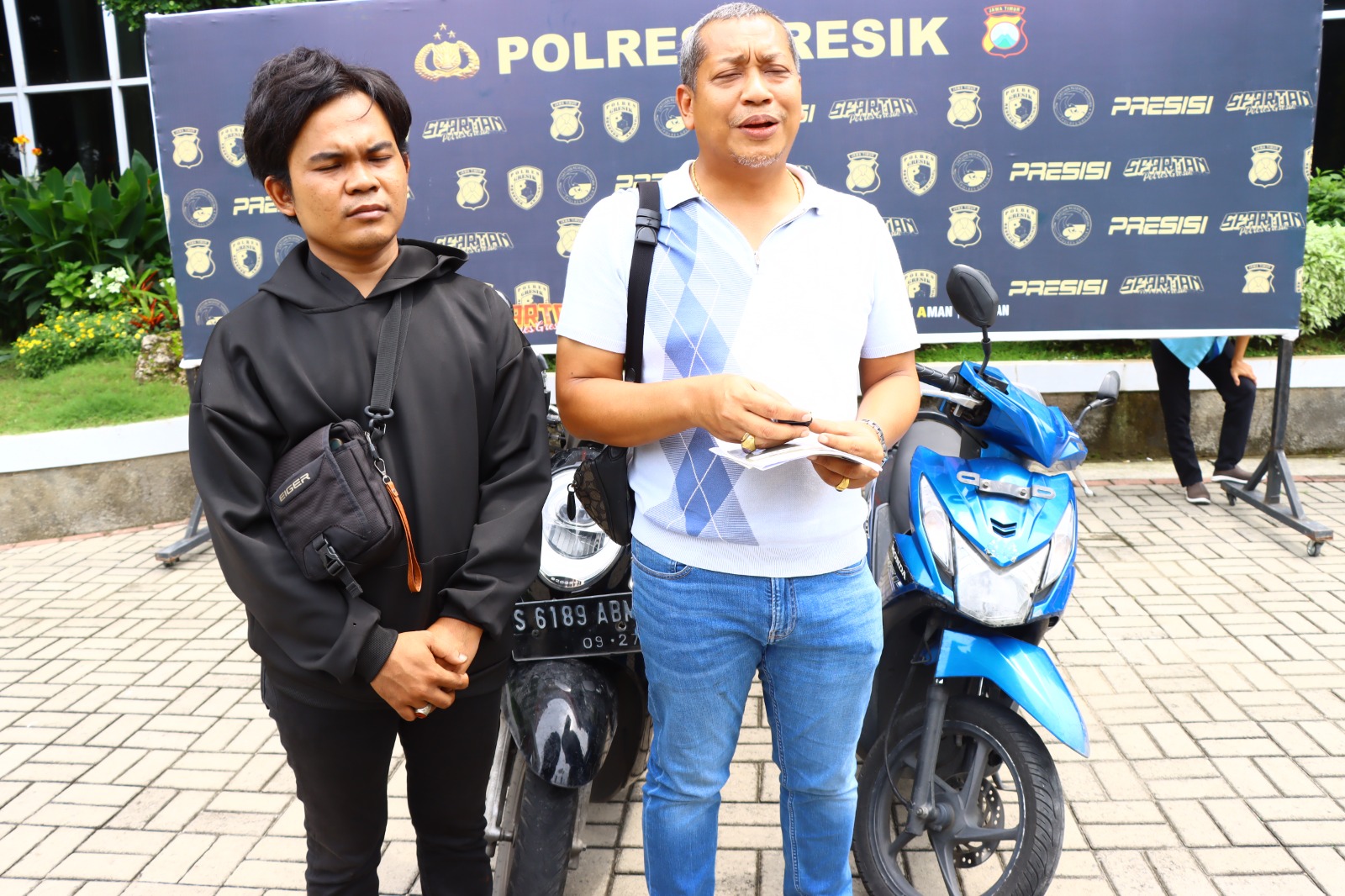 GRESIK – Liputan Warta Jatim, Kebahagiaan terpancar dari wajah Putro, warga Taman Dhika, Kabupaten Sidoarjo, dan Toyib, warga Rungkut, Kota Surabaya, setelah kendaraan mereka yang sempat hilang akibat pencurian akhirnya kembali ke tangan mereka.