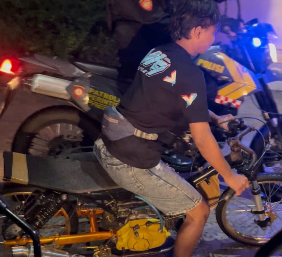 Sepeda motor tersebut tampak dalam kondisi dimodifikasi ala balap liar, tanpa kelengkapan standar keselamatan, dan menggunakan knalpot brong.