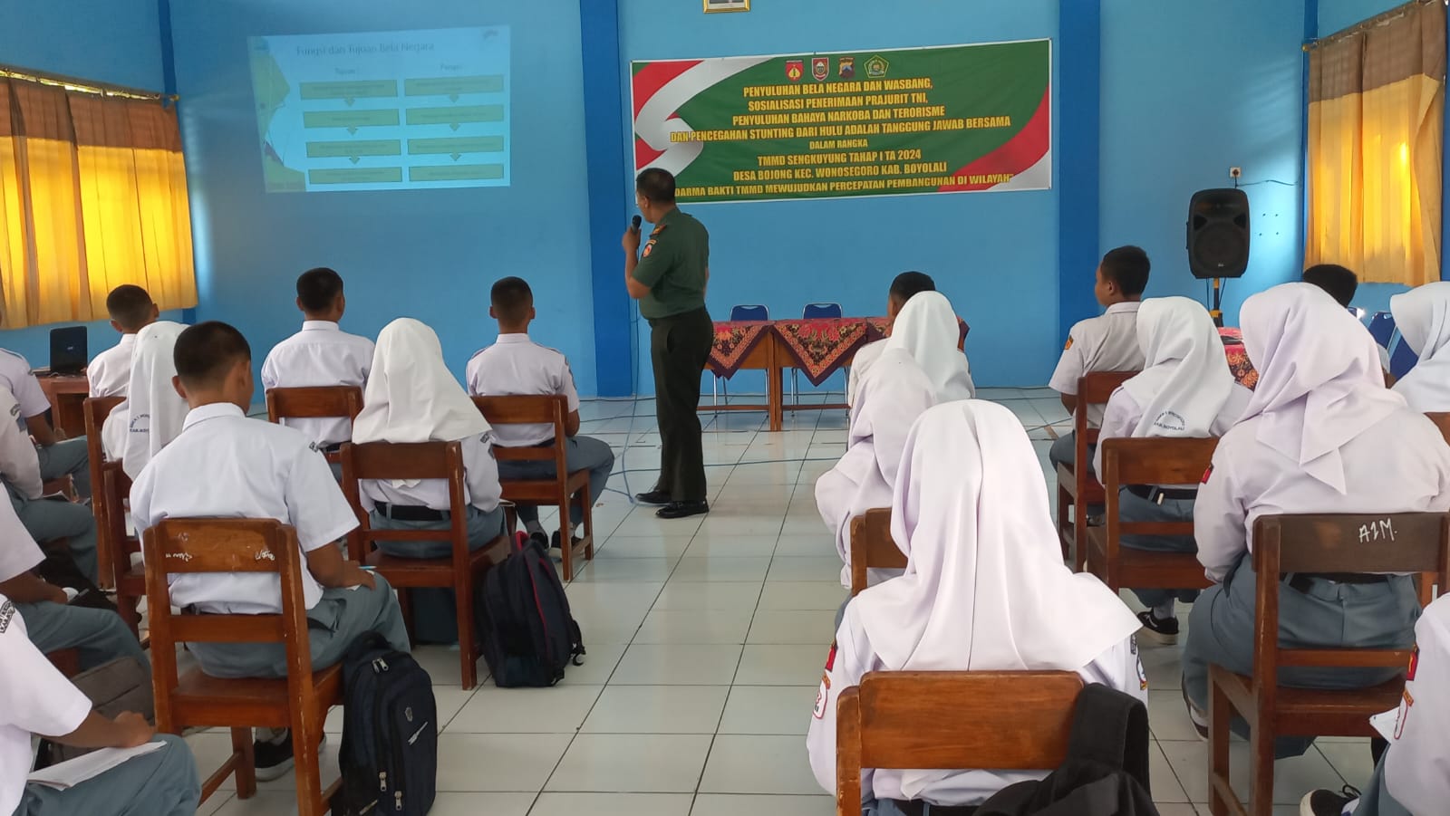 Satgas TMMD Sengkuyung tahap I tahun 2024 Kodim 0724/Boyolali memberikan penyuluhan Wawasan Kebangsaan dan penerimaan Prajurit kepada siswa dan siswi SMK N I Wonosegoro yang bertempat di Aula SMK N I Wonosegoro Jl Raya Wonosegoro Dusun III Kecamatan Wonosegoro Kabupaten Boyolali. Selasa ( 05/03/24).
