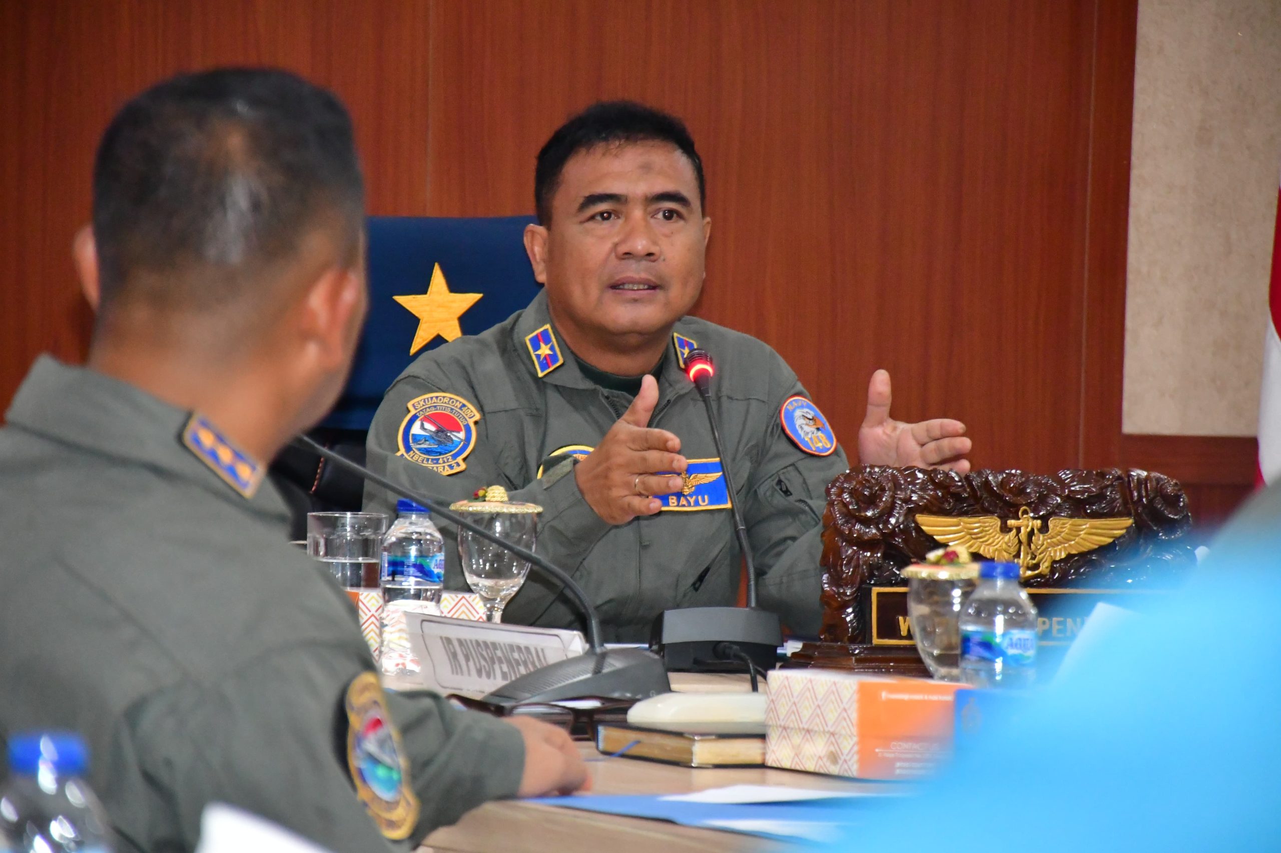 Tampak hadir Ir Puspenerbal, para Direktur Puspenerbal, Kafasharkan Pesud, Dankolat Penerbal, Danwing Udara 2 Juanda, Danlanudal Juanda dan para Kasatker Puspenerbal di luar Surabaya yang mengikuti Rapat Evaluasi secara virtual melalui jaringan vicon.